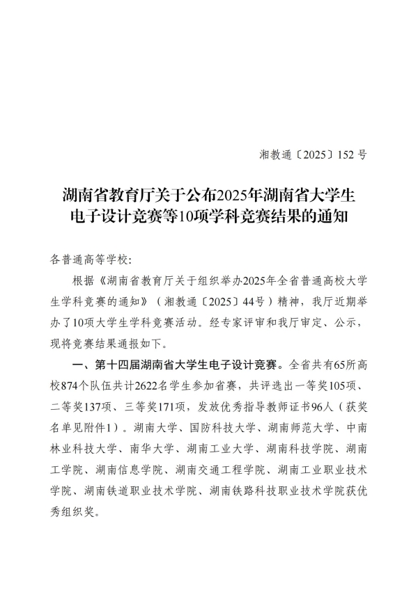 湖南省教育厅关于公布2025年湖南省大学生电子设计竞赛等10项学科竞赛结果的通知.pdf